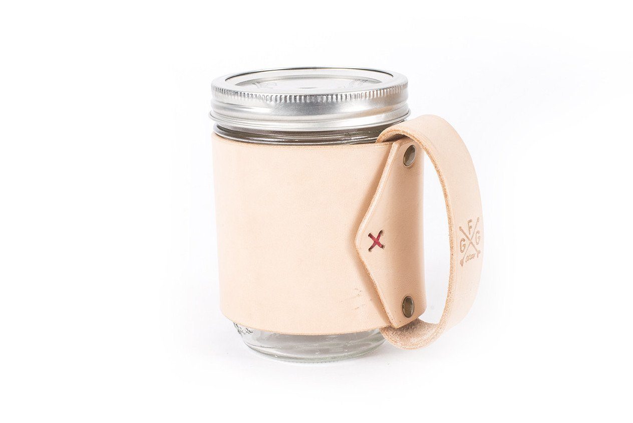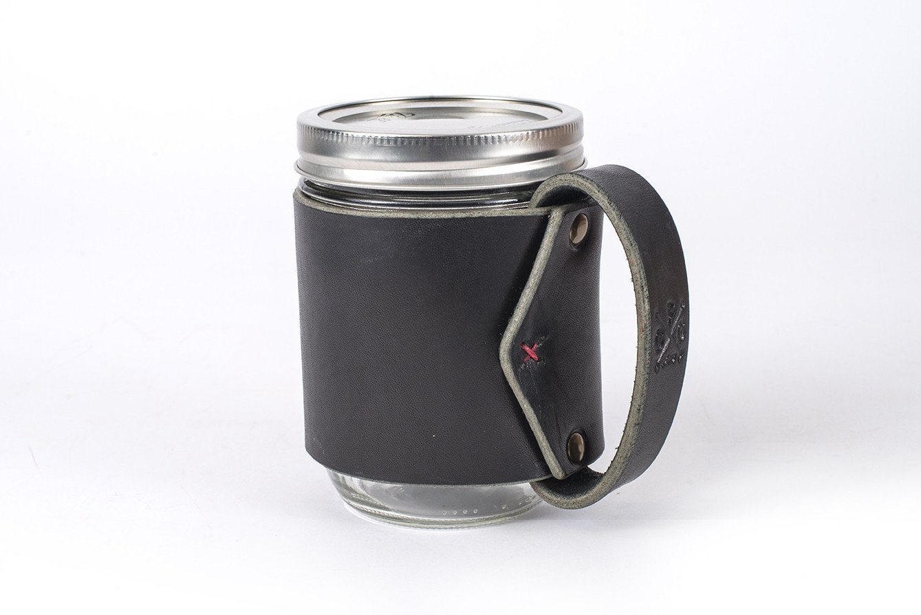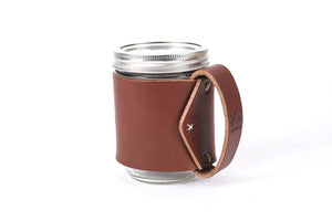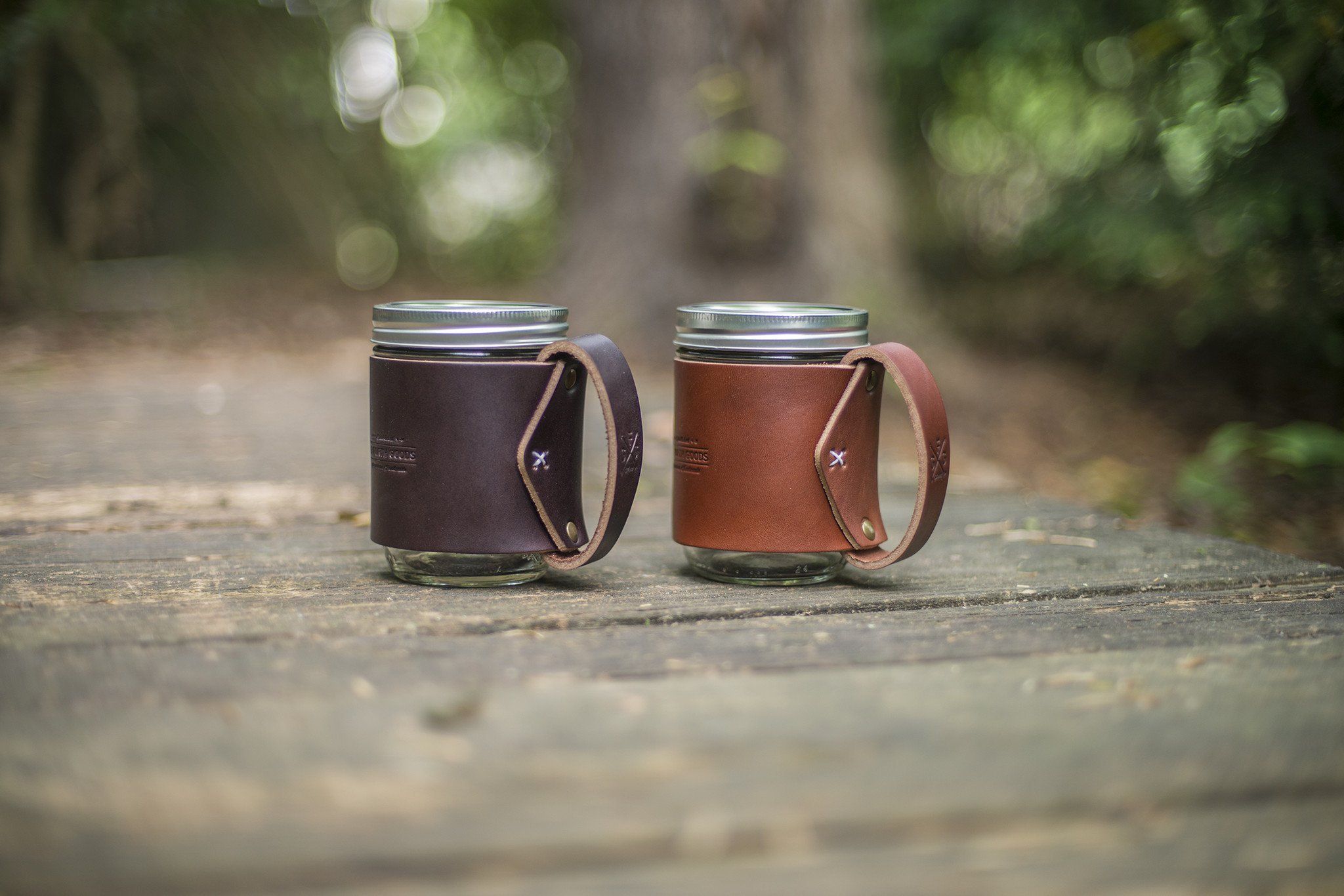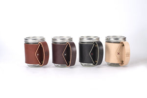 As seen in Atlanta Target stores! A 16 oz mason jar hugged in 9-10 oz veg tan Leather. Handle is made with the same 9-10 oz leather and attached with solid brass rivets so it's nice and sturdy. Great for that cup of joe, sweet tea on the go and in the evening your favorite pint of beer or bourbon.