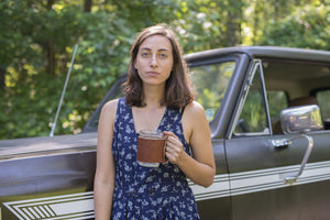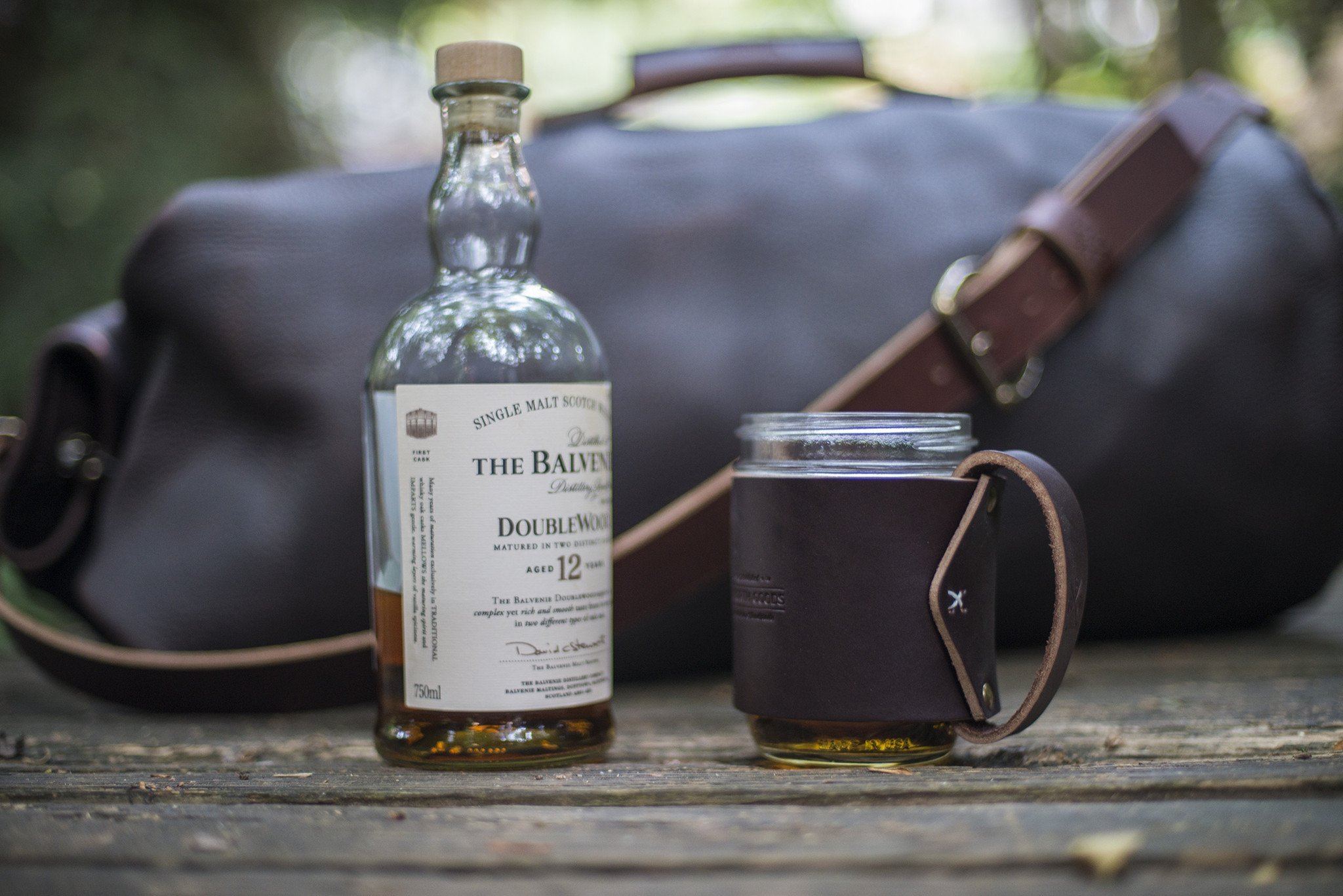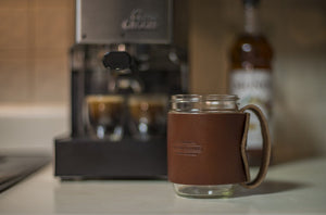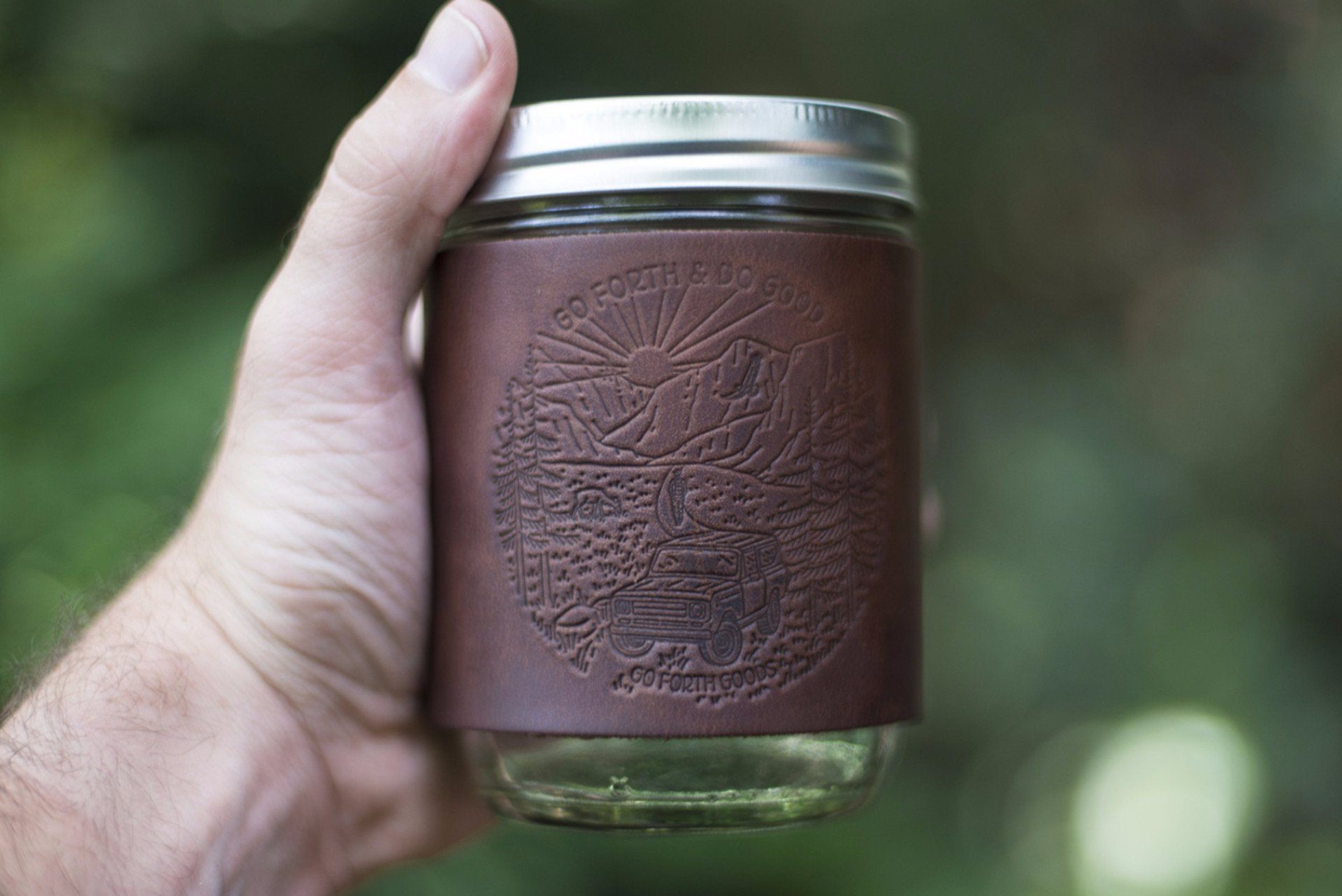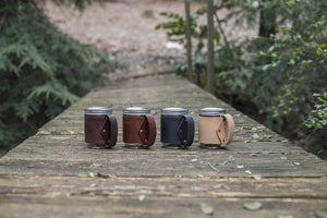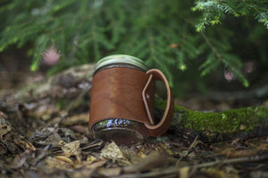 As seen in Atlanta Target stores! A 16 oz mason jar hugged in 9-10 oz veg tan Leather. Handle is made with the same 9-10 oz leather and attached with solid brass rivets so it's nice and sturdy. Great for that cup of joe, sweet tea on the go and in the evening your favorite pint of beer or bourbon.