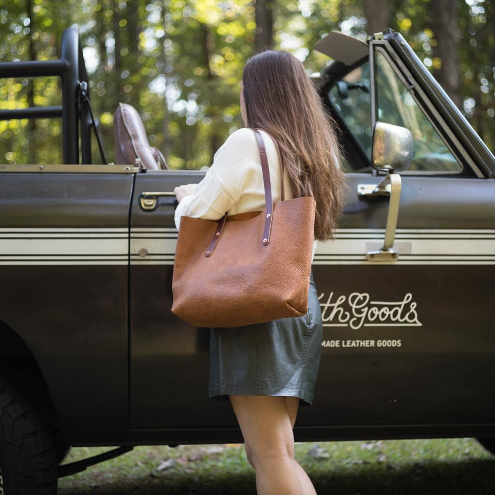 We make our Avery Leather Tote Bag by hand in small batches with 100% full-grain 6 oz. American leather in our shop in Marietta, GA, and as always, it’s fully covered by our Lifetime Guarantee.