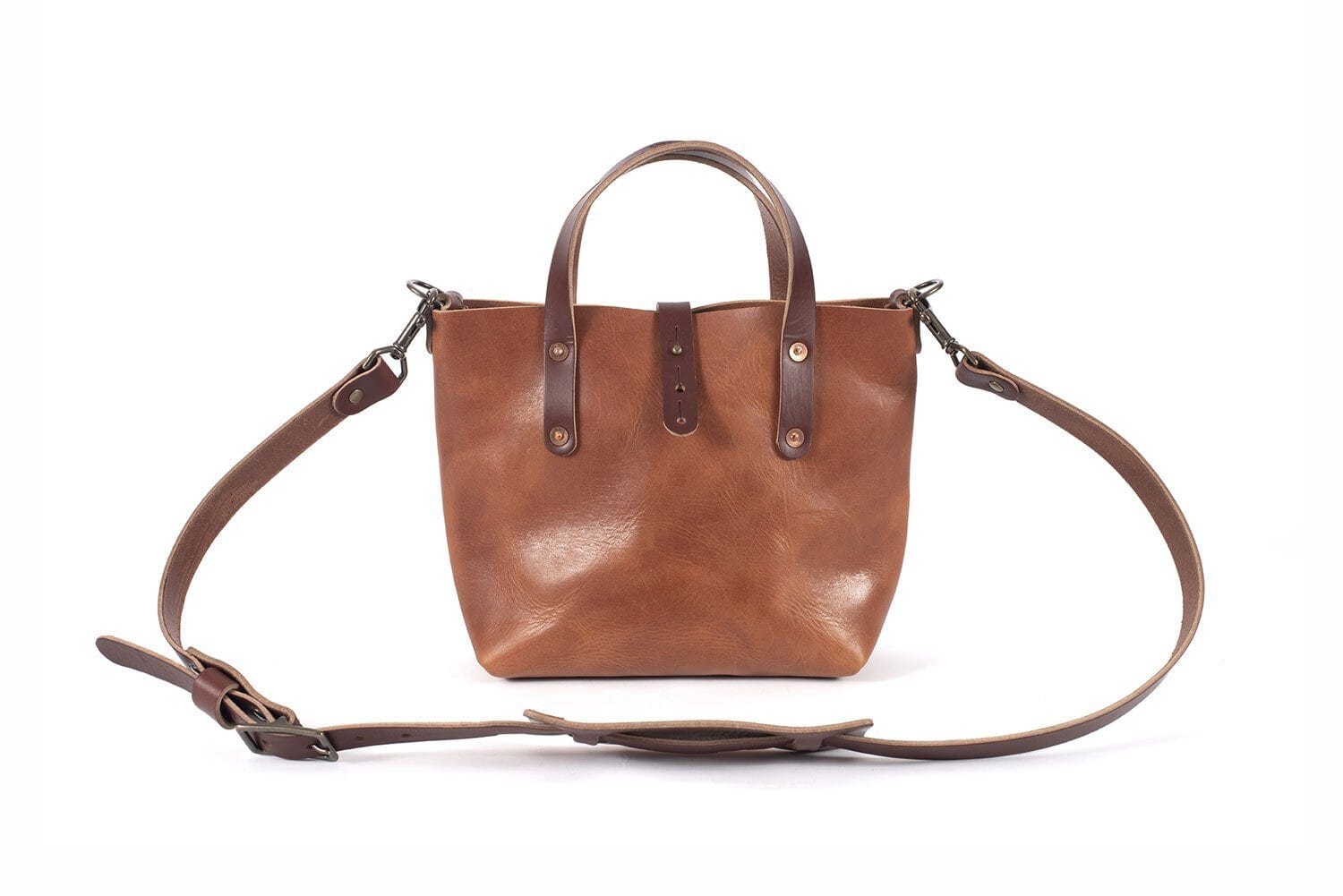 Everyone needs that perfect everyday bag. With versatility, usability, and comfort, our Avery Leather Tote Bag Mini Crossbody will be that bag for you. It has 5.1 liters of room for a wallet, cell phone, sunglasses, notebook, makeup, keys, and more. Inside there is one pocket perfect for your cell phone or other small accessories, as well as a convenient key clip. Just fill it with your essentials and carry it by the durable 10 oz. leather handles. Comes standard with an adjustable and removable crossbody strap with button stud strap enclosure.  This mini leather crossbody bag is the perfect bag for hands-free daily carry of all your essentials.
