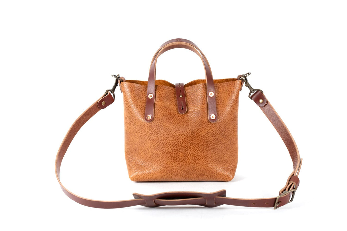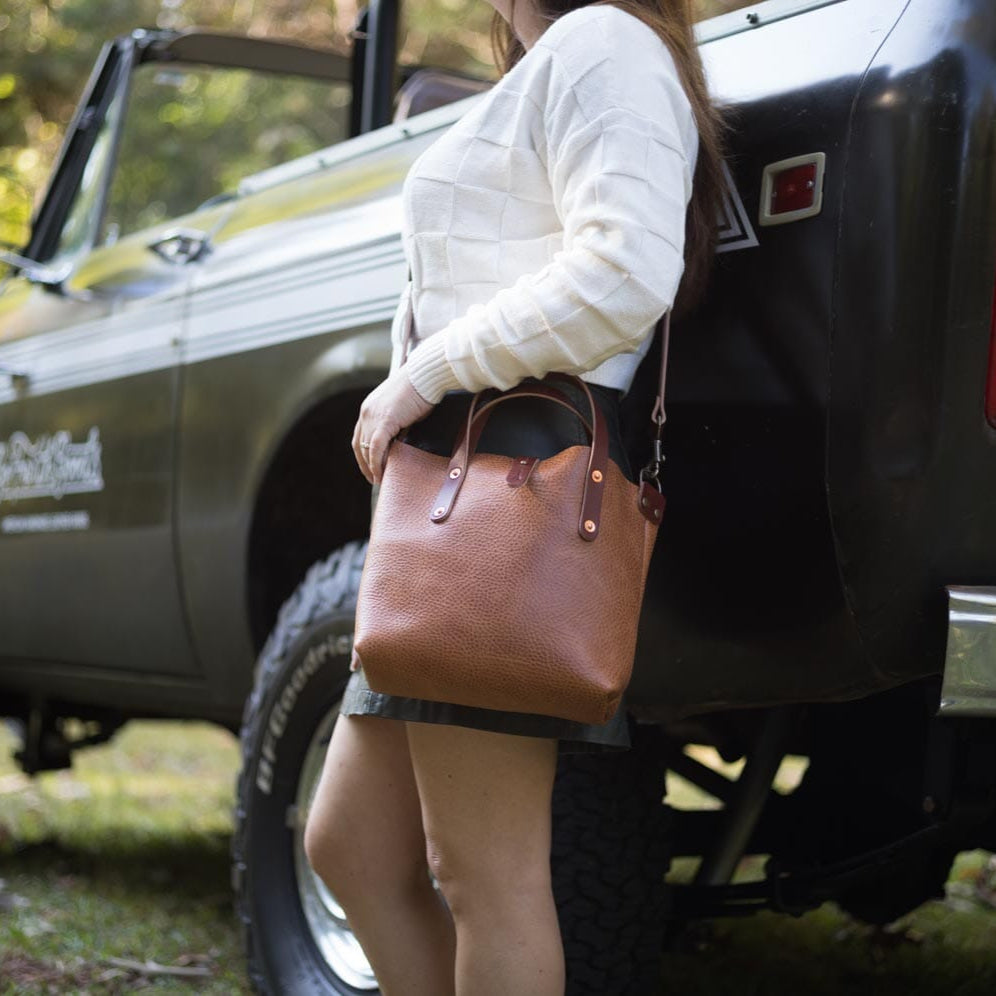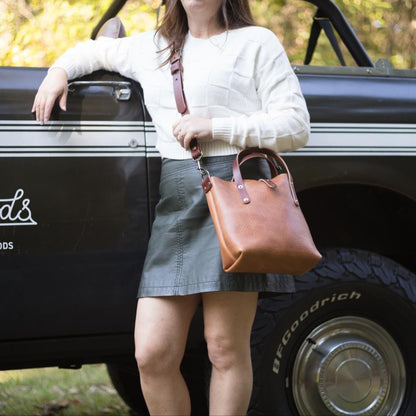 Everyone needs that perfect everyday bag. With versatility, usability, and comfort, our Avery Leather Tote Bag Mini Crossbody will be that bag for you. It has 5.1 liters of room for a wallet, cell phone, sunglasses, notebook, makeup, keys, and more. Inside there is one pocket perfect for your cell phone or other small accessories, as well as a convenient key clip. Just fill it with your essentials and carry it by the durable 10 oz. leather handles. Comes standard with an adjustable and removable crossbody strap with button stud strap enclosure.  This mini leather crossbody bag is the perfect bag for hands-free daily carry of all your essentials.
