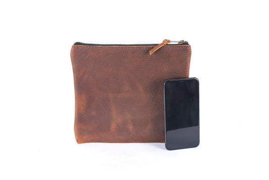 LEATHER TOP ZIPPERED POUCH - SMALL - PEANUT BISON