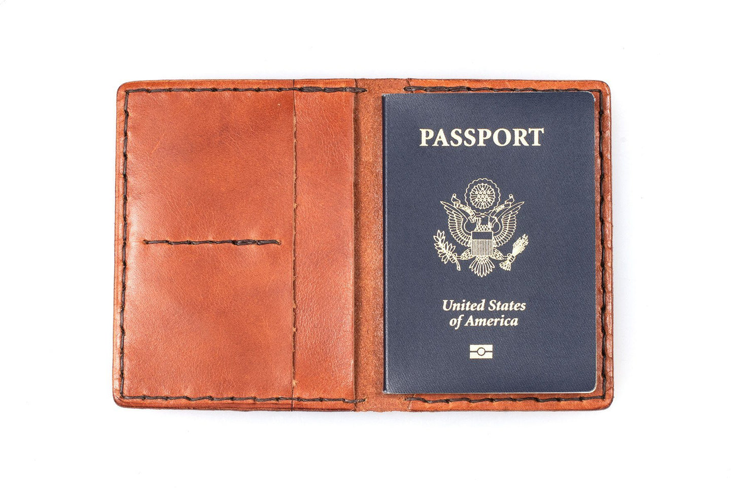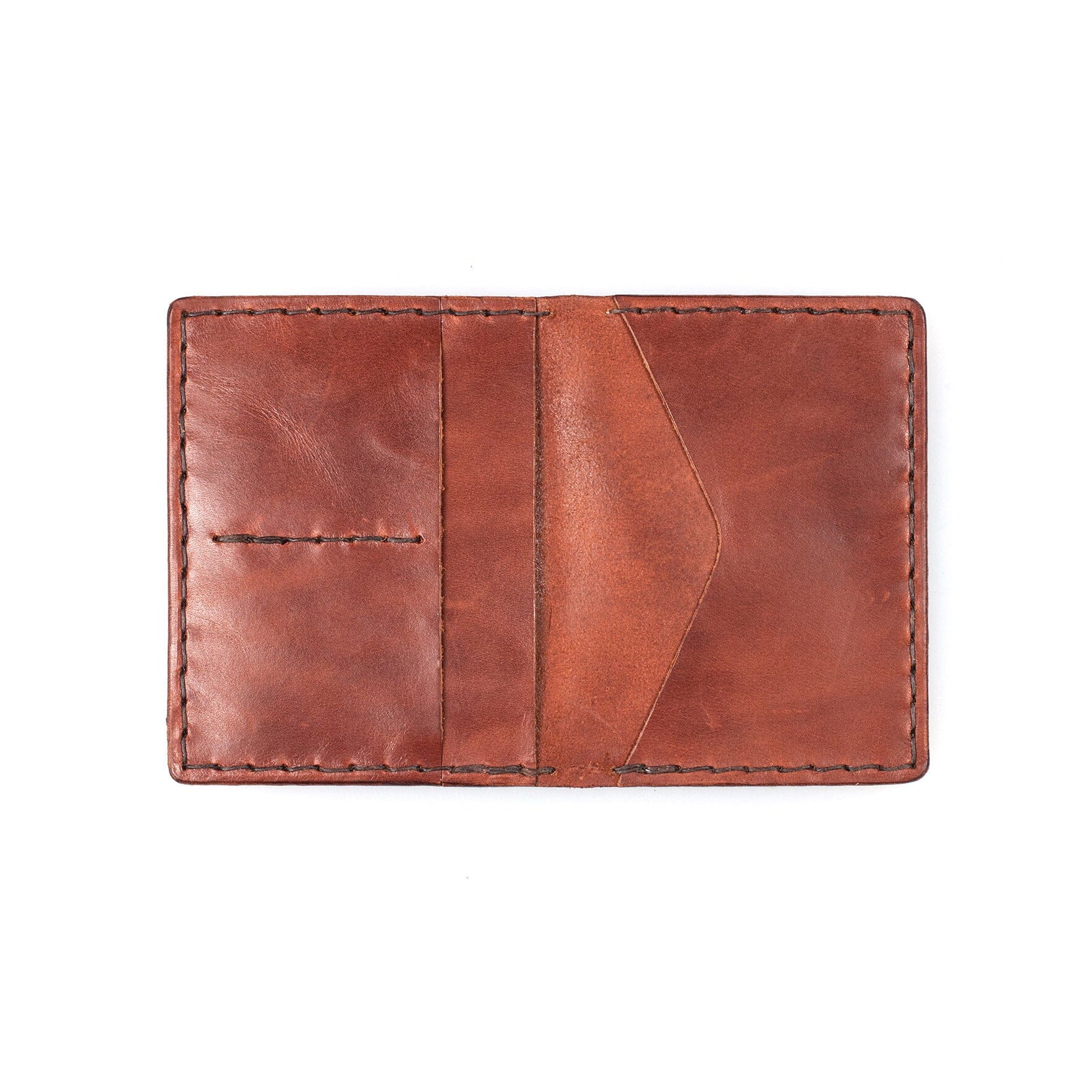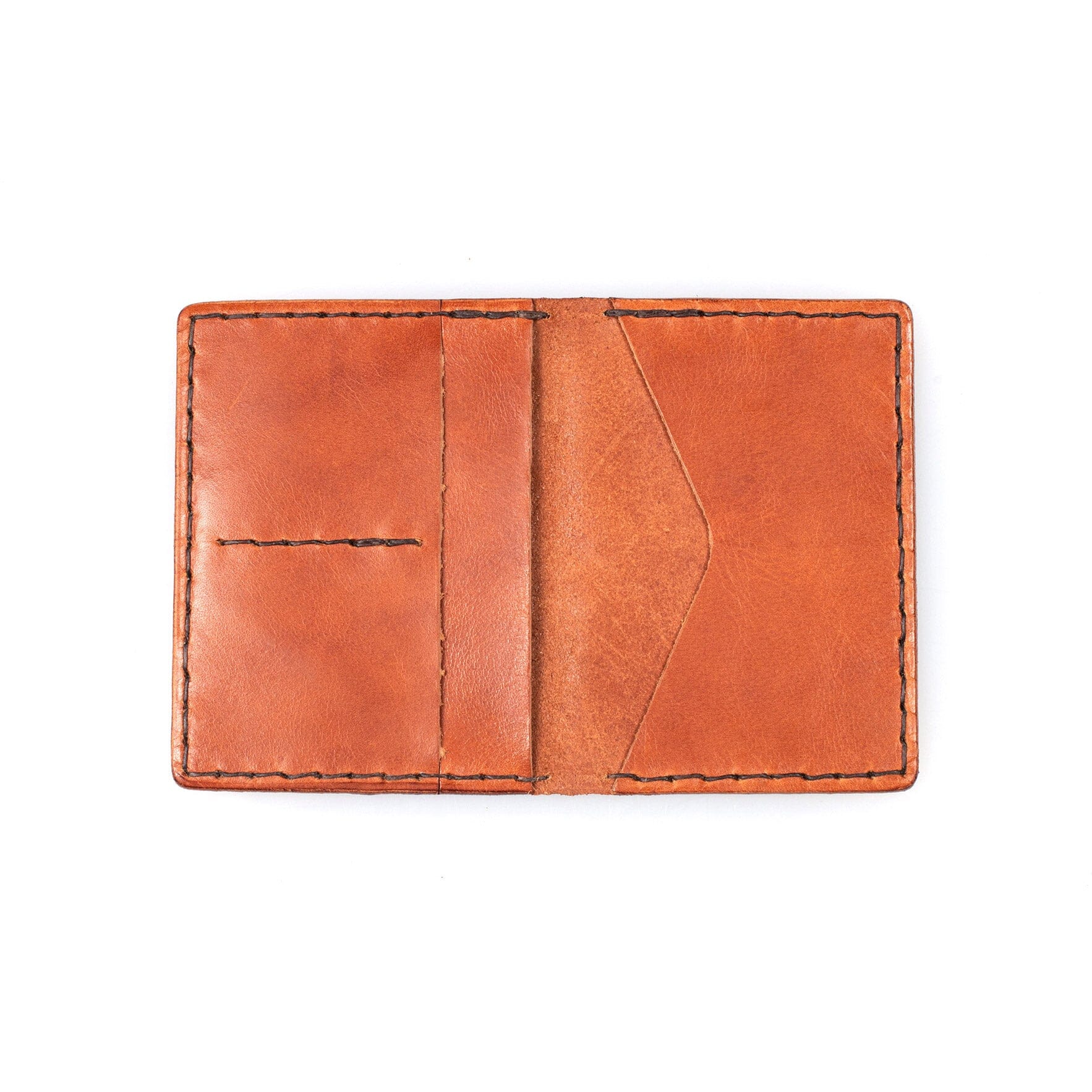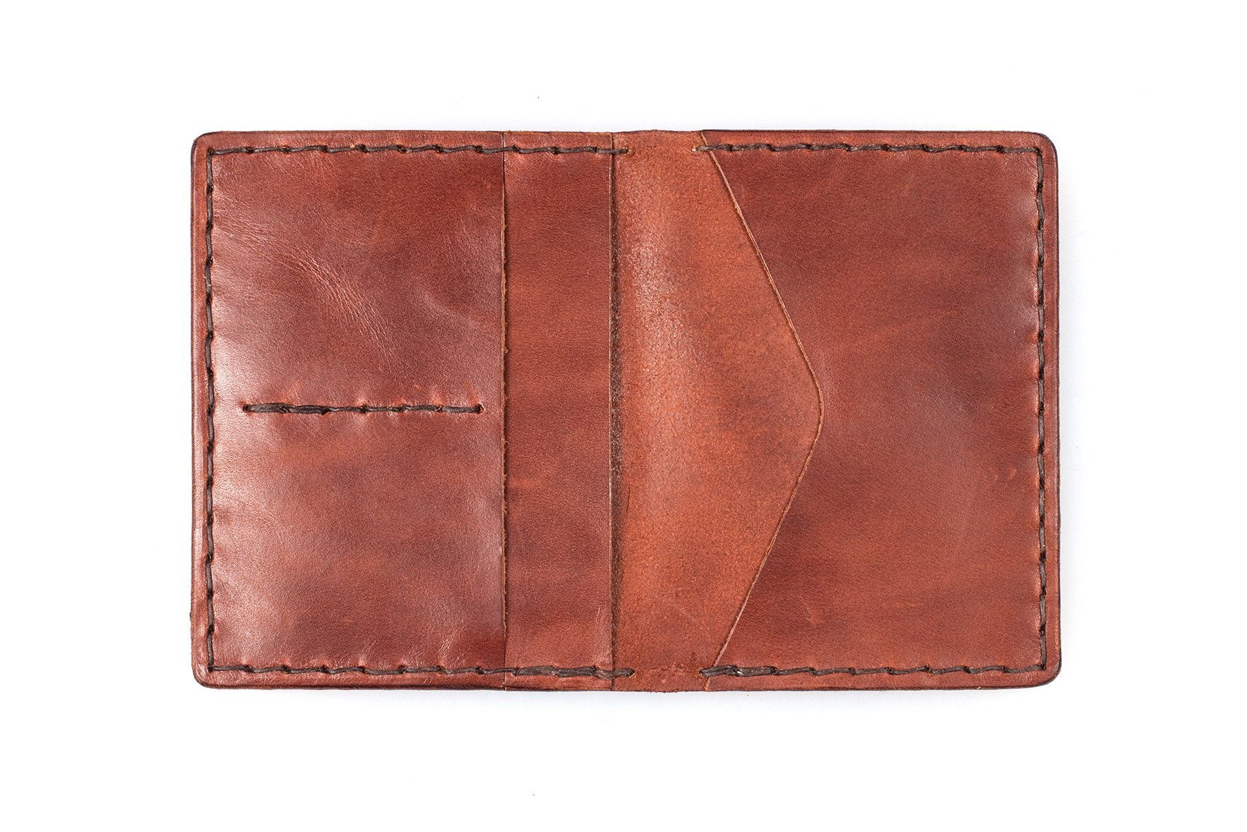 The adventure leather travel wallet is handmade in the USA and is the perfect wallet for the traveling man or woman.  Features two card pockets, a cash pocket and a place for your passport or a small notebook.  Made with 3-4oz full-grain veg tan bridle leather and is hand stitched with waxed thread.