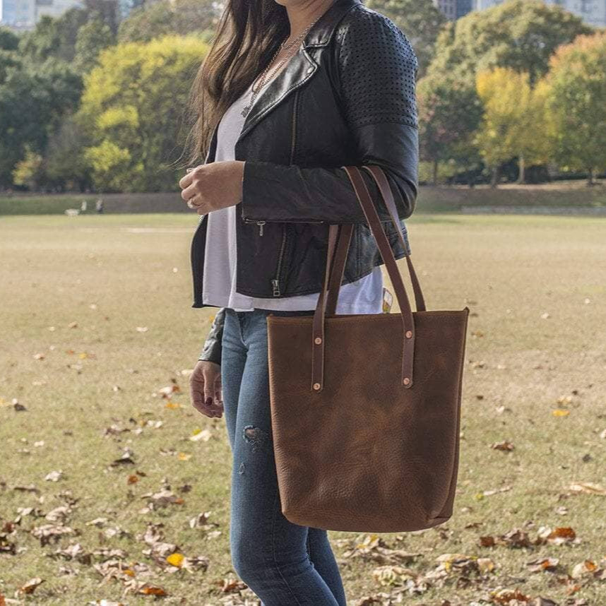We make our Avery Leather Tote Bag by hand in small batches with 100% full-grain 6 oz. American leather in our shop in Marietta, GA, and as always, it’s fully covered by our Lifetime Guarantee.