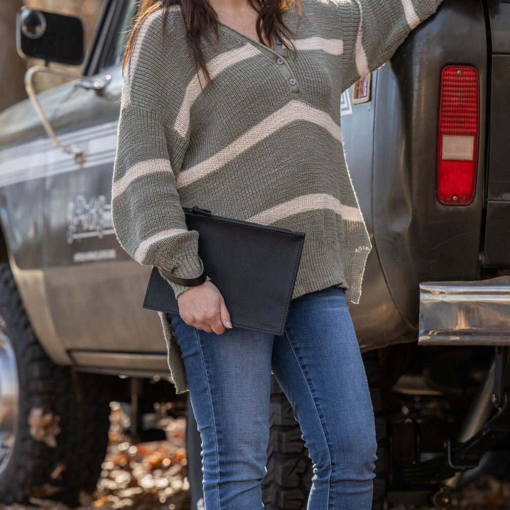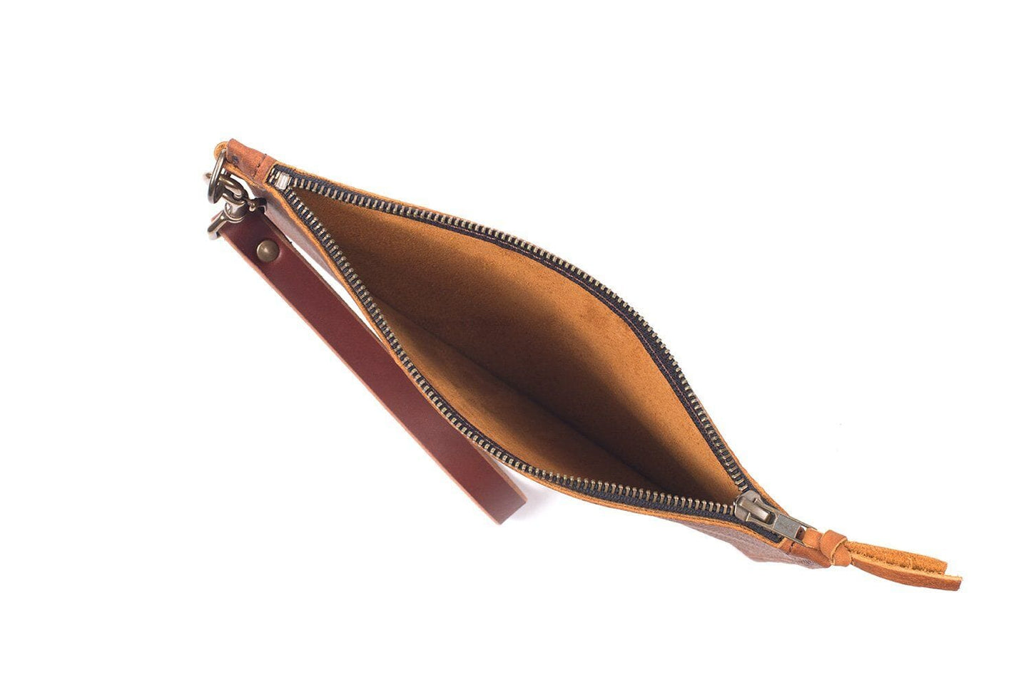 The Felicity Zippered Clutch with Wristlet Small is the perfect Smaller companion for a night out on the town, a wedding, or just whenever you want to keep things simple. Hand made with premium full-grain leather, solid brass hardware, and a YKK zipper closure to keep all your belongings secure inside. It is 11"W X 7"H and will hold a smaller wallet, phone, keys, make-up, and other essentials.